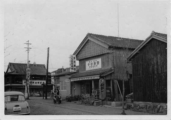 中谷商会は農機具を商ったタケシの生家、これは1963年(昭和38年)の写真。伊勢市八日市場町、現在はその土地にコンビニが 建つ。タケシは高校卒業までこの店舗兼住まいで暮らし上京、数年後の1981年頃この家屋も取り壊されることとなる。
